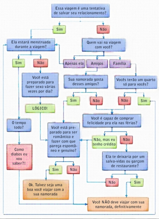 Está na dúvida se viaja ou não com a sua namorada no final de semana? A gente te ajuda a decidir! O fluxograma acima é útil também para viagens com a esposa ou qualquer outro tipo relacionamento com o sexo feminino.