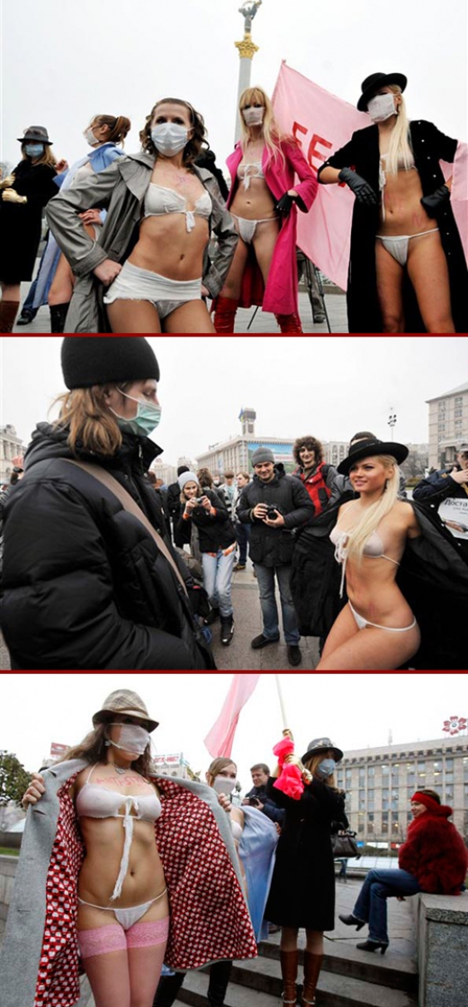 Nessa semana, feministas da Ucrânia protestaram na Praça da Independência de Kiev contra o governo do país. Mas, ao invés de queimarem sutiãs, elas confeccionaram lingeries com máscaras protetoras. A acusação é de que a nova gripe está sendo usada para causar medo pré-eleitoral.