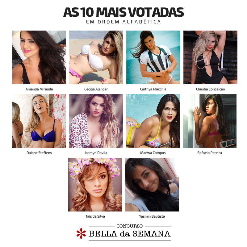 Estas são as 10 modelos mais votadas no Concurso do Bella da Semana até o momento, em ordem alfabética. As votações encerram domingo, mas ainda dá tempo de acessar o link e dar uma forcinha àquela modelo que mais te chamou a atenção.