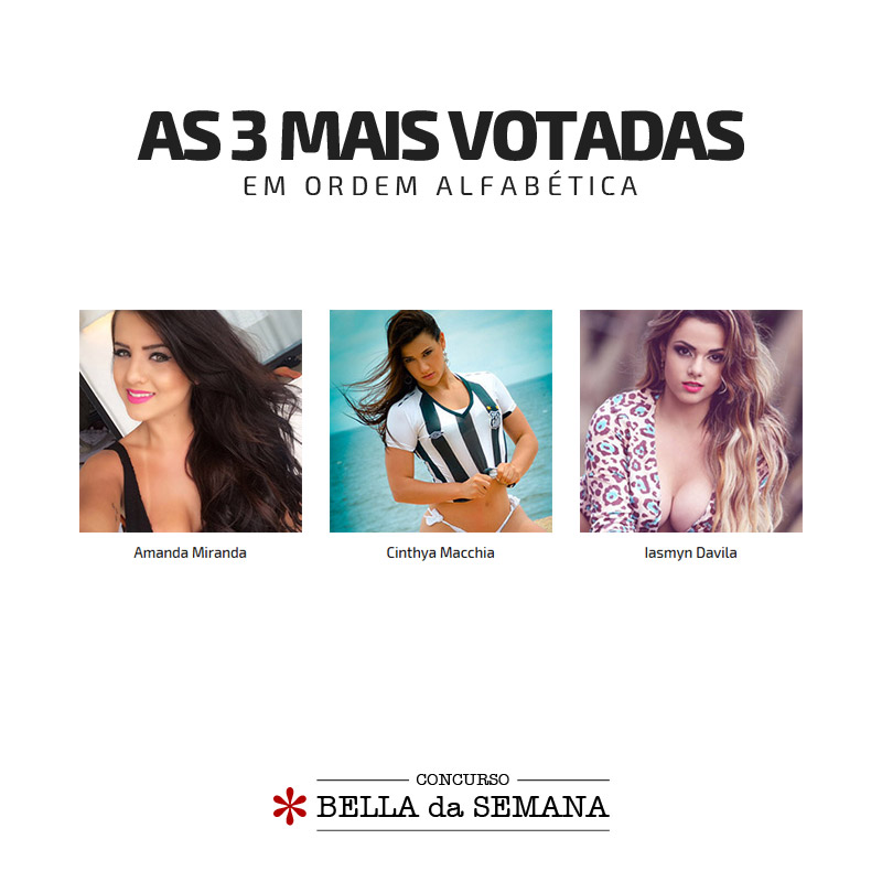 Uma dessas três modelos é a grande vencedora do Concurso Bella da Semana! Vocês votaram em uma das 40 candidatas para ocupar o posto de mulher mais bela da Internet brasileira, e o resultado final será divulgado neste domingo, dia 1º de março.