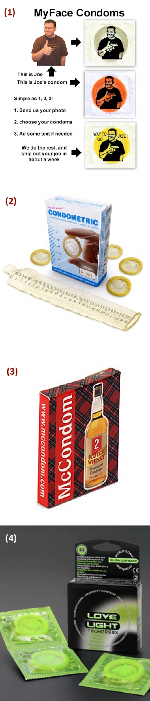 É sempre legal dar uma animada na vida sexual. Você já pensou que pode tentar fazer isso usando tipos diferentes de camisinhas? Essas acima são alguns exemplos do que é oferecido pelo mundo quando o assunto é proteção de maneira inusitada.