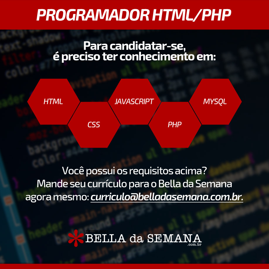 Já pensou em trabalhar no Bella da Semana, a maior revista masculina do Brasil? Sua chance pode estar aqui! Estamos em busca de um programador com amplo conhecimento em HTML, CSS, Javascript, PHP e MySQL. Ah, o candidato deve residir em Florianópolis (SC) ou região.