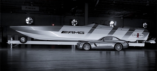 A esportividade e a performance dos carros da Mercedes-Benz conseguem ser inspiração para qualquer tipo de veículo. Um bom exemplo está nesta lancha criada em uma parceria entre a montadora alemã e a marca de barcos de competição Cigarette Racing. O modelo foi desenhado a partir das linhas do SLS AMG, o novo esportivo da alemã.