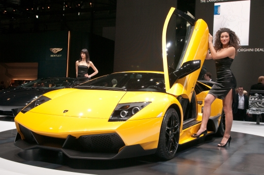 Na foto: Modelo ao lado de um Lamborghini Murciélago LP 670-4 SuperVeloce no Salão de Genebra 2009.