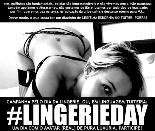 Depois do #forasarney, a mais nova campanha do Twitter é o #lingerieday. O movimento no mundo virtual está marcado para acontecer na próxima quarta-feira (29 de julho) e a ideia é que as mulheres troquem o avatar por uma foto sua vestindo lingerie.